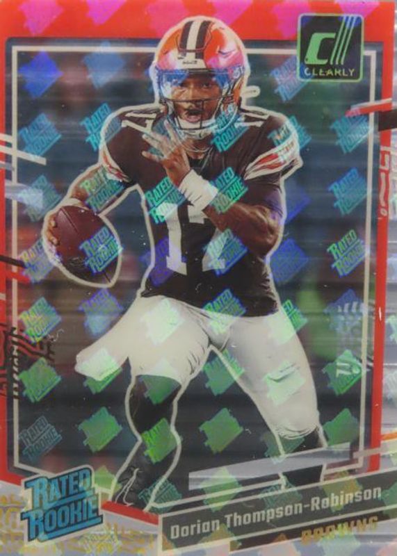 This card is 1 of 15 Dorian Thompson-Robinson's card variations in the 2023 Clearly Donruss set being tracked by Sports Card Investor, including Base, Gold, Holo Mosaic, Purple /199, and Blue /99.