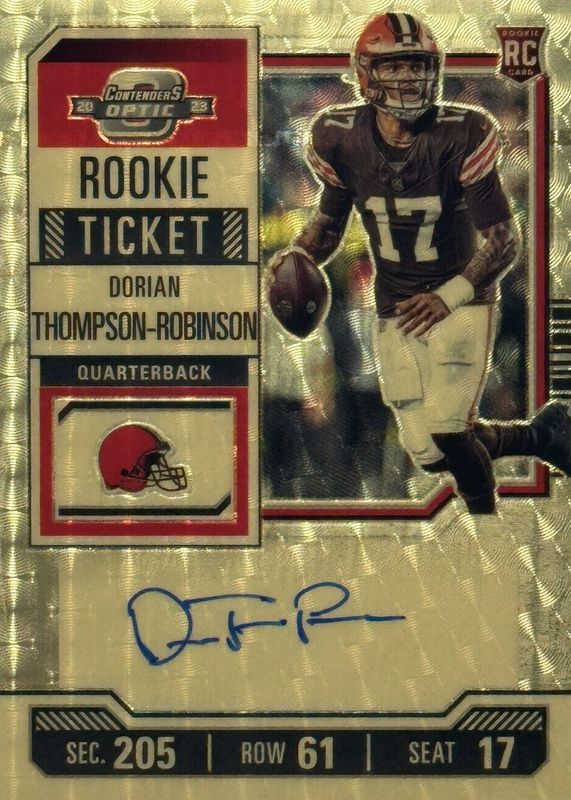 The Dorian Thompson-Robinson 2023 Contenders Optic #110 Rookie Ticket Auto - Gold Vinyl /1 card in Raw condition has not changed in price in the last 30 days and was last sold for $421.00 .