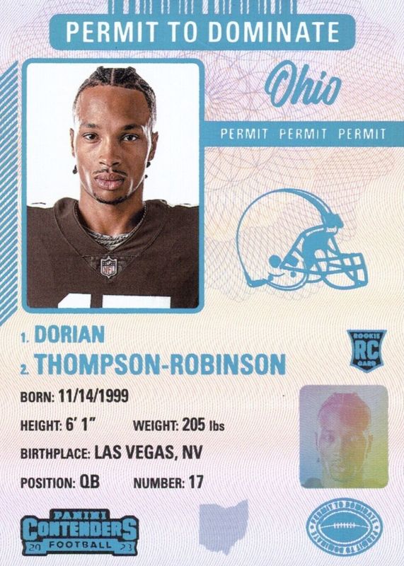The Dorian Thompson-Robinson 2023 Contenders #11 Permit to Dominate /(SSP) Rookie card in Raw condition has not changed in price in the last 30 days and was last sold for $2.50 .