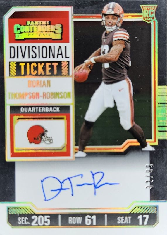 The Dorian Thompson-Robinson 2023 Contenders #110 Rookie Ticket Auto - Divisional Ticket /99 card in Raw condition has not changed in price in the last 30 days and was last sold for $3.60 .