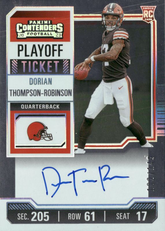 The Dorian Thompson-Robinson 2023 Contenders #110 Rookie Ticket Auto - Playoff Ticket /149 card in Raw condition has not changed in price in the last 30 days and was last sold for $3.25 .