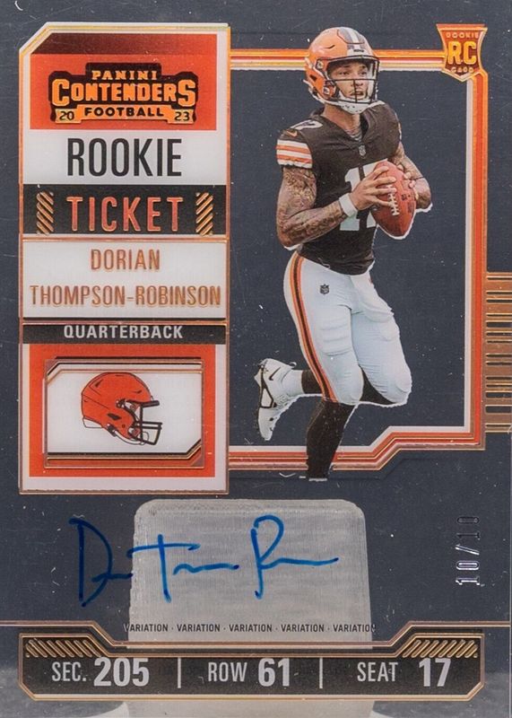 The Dorian Thompson-Robinson 2023 Contenders #110 Rookie Ticket Auto Variation - Clear Ticket /10 card in Raw condition has not changed in price in the last 30 days and was last sold for $160.27 .