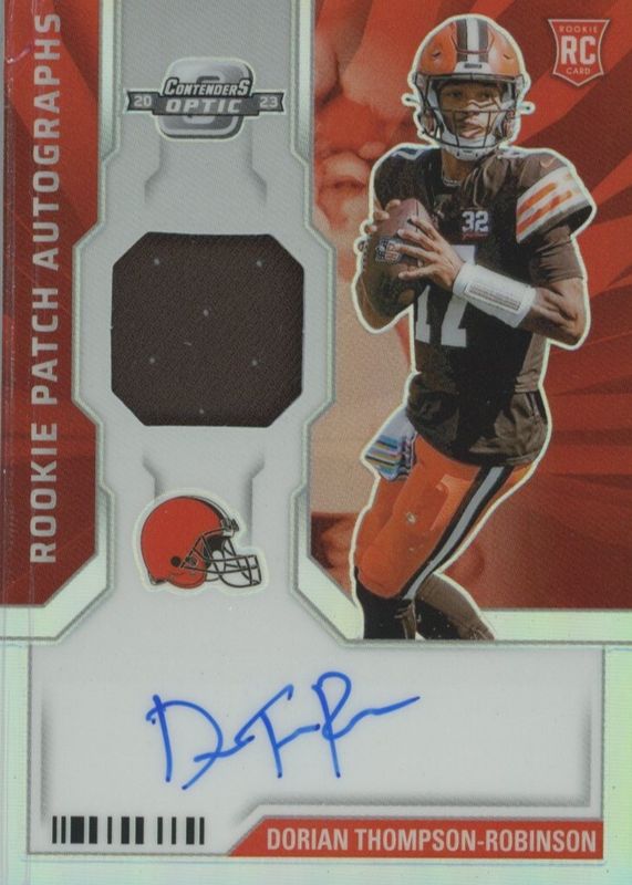 The Dorian Thompson-Robinson 2023 Contenders #TS10 Rookie Ticket Swatches Autographs /25 card in Raw condition has not changed in price in the last 30 days and was last sold for $9.50 .