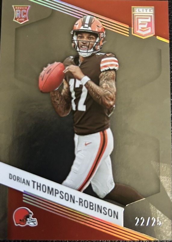 This card is 1 of 34 Dorian Thompson-Robinson's card variations in the 2023 Elite set being tracked by Sports Card Investor, including Base Rookie /999, Aspirations (/83), Green Disco, Pink, and Status (/17).