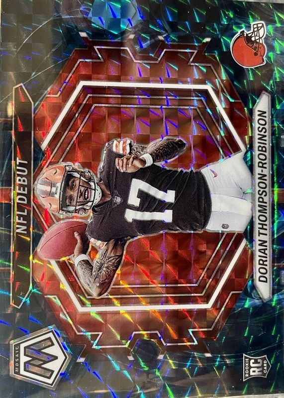 The Dorian Thompson-Robinson 2023 Mosaic #ND-6 NFL Debut - Genesis /(SSP) Rookie card in Raw condition has not changed in price in the last 30 days and was last sold for $10.00 .