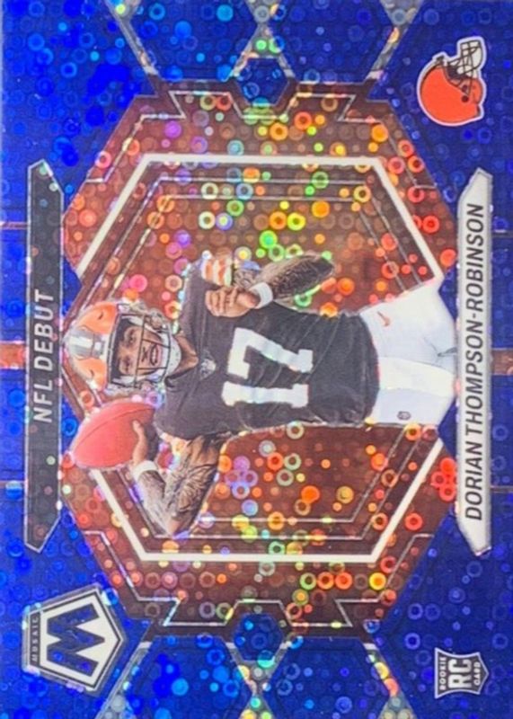 The Dorian Thompson-Robinson 2023 Mosaic #ND-6 NFL Debut - No Huddle Blue /75 Rookie card in Raw condition has not changed in price in the last 30 days and was last sold for $1.25 .