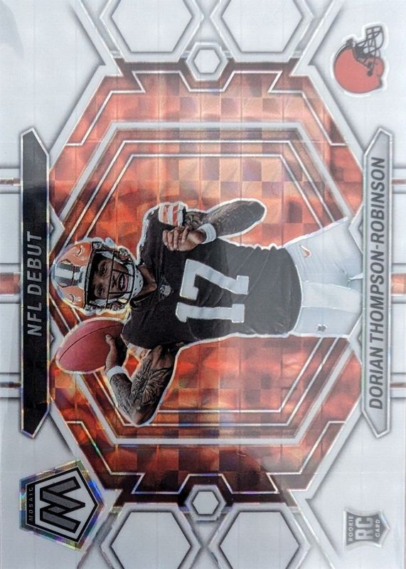 The Dorian Thompson-Robinson 2023 Mosaic #ND-6 NFL Debut - White /25 Rookie card in Raw condition has not changed in price in the last 30 days and was last sold for $5.50 .