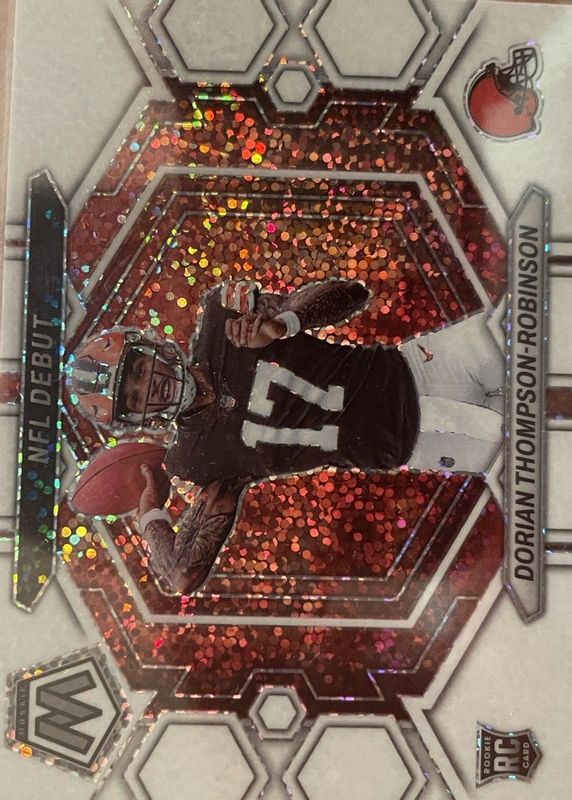 The Dorian Thompson-Robinson 2023 Mosaic #ND-6 NFL Debut - White Sparkle /(SSP) Rookie card in Raw condition has not changed in price in the last 30 days and was last sold for $55.00 .