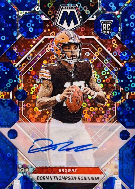 The Dorian Thompson-Robinson 2023 Mosaic #316 Rookie Autographs - No Huddle Blue card in Raw condition has not changed in price in the last 30 days and was last sold for $35.00 .