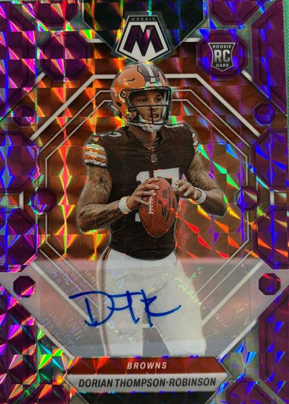 The Dorian Thompson-Robinson 2023 Mosaic #316 Rookie Autographs - Purple (/49) card in Raw condition has not changed in price in the last 30 days and was last sold for $7.00 .