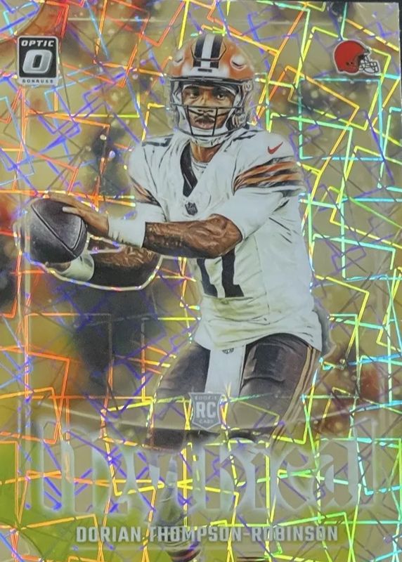 The Dorian Thompson-Robinson 2023 Optic #12 Mythical /(SSP) Rookie card in Raw condition has moved up $3.38 (+56.3%) in the last 30 days and was last sold for $9.38 .