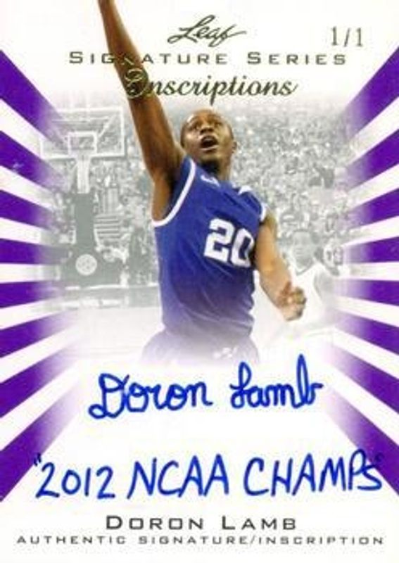 The Doron Lamb 2012 Leaf Signature Series #IA-DL2 Inscriptions - Purple /1 Rookie card is 1 of 43 Doron Lamb's card variations in the 2012 Leaf Signature Series set being tracked by Sports Card Investor, including Base, Silver /99, Gold /25, Blue /10, and Red /5.