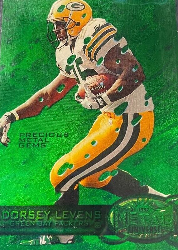 Dorsey Levens' Football cards are available in at least 34 sets. Dorsey Levens' biggest 7-day price movers are 1997 Metal Universe #131 Precious Metal Gems Green /15, 1998 Skybox E-X2001 #20 Essential Credentials Now (/20), and 1997 Metal Universe #131 Precious Metal Gems Red /135.