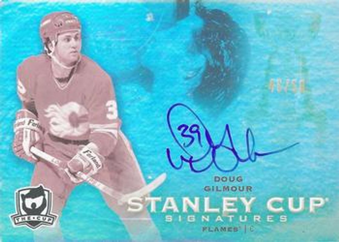 The Doug Gilmour 2009 Upper Deck The Cup #SC-DG Stanley Cup Signatures /50 card is 1 of 5 Doug Gilmour's card variations in the 2009 Upper Deck The Cup set being tracked by Sports Card Investor, including Signatures Patches /75, Enshrinements /50, Foundations Jerseys Autographs /10, and Foundations Patches Autographs /5.