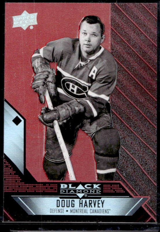 The Doug Harvey 2014 Upper Deck Black Diamond #92 Ruby /50 card is 1 of 5 Doug Harvey's card variations in the 2014 Upper Deck Black Diamond set being tracked by Sports Card Investor, including Base, Orange, Emerald /10, and Sapphire /1.
