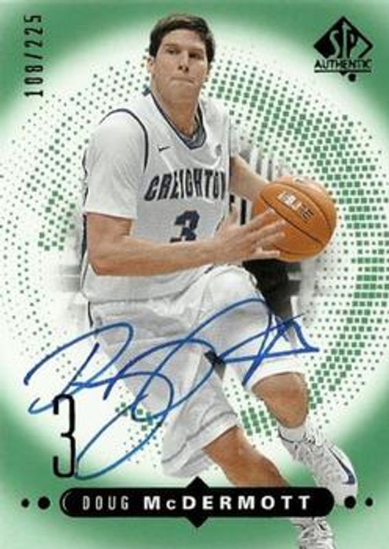 The Doug McDermott 2014 SP Authentic #R13 Rookie Extended Autographs Emerald /225 card is 1 of 12 Doug McDermott's card variations in the 2014 SP Authentic set being tracked by Sports Card Investor, including Base /175, Limited /175, Flair Jambalaya, Flair Showcase Row 0 Autographs, and Flair Showcase Row 1 Autographs.