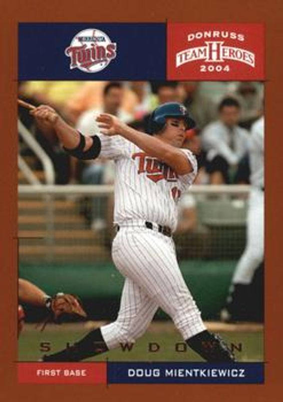 The Doug Mientkiewicz 2004 Donruss Team Heroes #245 Showdown - Bronze /150 card is 1 of 4 Doug Mientkiewicz's card variations in the 2004 Donruss Team Heroes set being tracked by Sports Card Investor, including Base, Showdown - Silver /50, and Showdown - Gold /10.