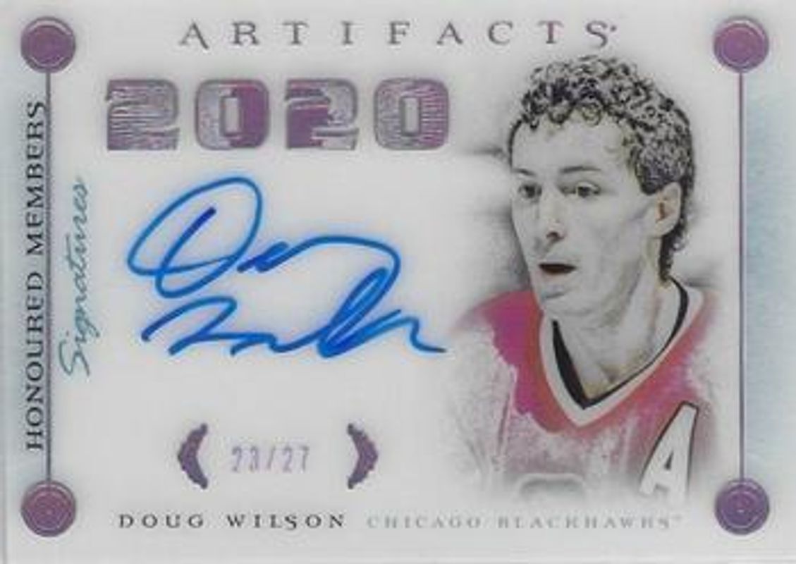 Doug Wilson's Hockey cards are available in at least 70 sets. Doug Wilson's biggest 7-day price movers are 2021 Upper Deck Artifacts #HMS-DW Honoured Members Signatures /27, 2022 Upper Deck Artifacts #RAF-DW 2005 Retro Auto Facts, and 2022 Upper Deck Trilogy #TG-7A Generations Autographs - Gold /10.