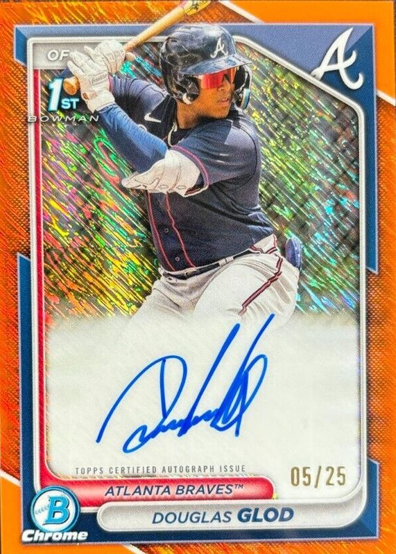 The Douglas Glod 2024 Bowman #CPA-DG Chrome Prospect Auto - Orange Shimmer Refractor /25 (1st) card in Raw condition has not changed in price in the last 30 days and was last sold for $39.99 .