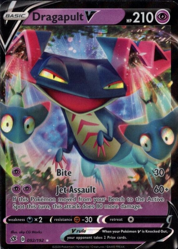 The Dragapult V 2020 Sword & Shield: Rebel Clash #092/192 Holo card in Raw TCG (Near Mint) condition has moved up $0.50 (+17.5%) in the last 30 days and was last sold for $3.35 .