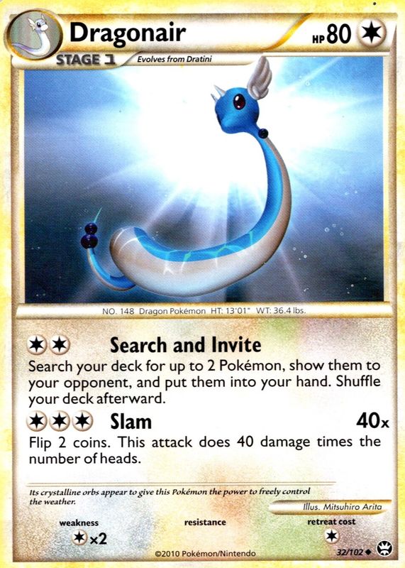 The Dragonair 2010 HeartGold & SoulSilver: Triumphant #032/102 Base card in Raw TCG (Lightly Played) condition has moved up $1.77 (+179%) in the last 30 days and was last sold for $2.76 .
