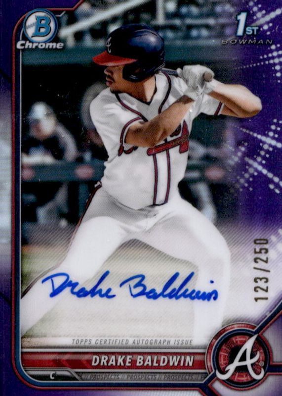 The Drake Baldwin 2022 Bowman Draft #CDA-DBN Chrome DP Auto - Purple Refractor /250 (1st) card in Raw condition has moved up $70.00 (+40.0%) in the last 30 days and was last sold for $245.00 .