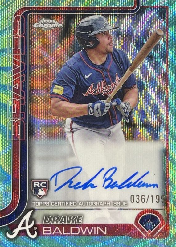 The Drake Baldwin 2025 Topps Chrome #RA-DBA Rookie Autographs - Aqua Wave Refractor /199 card in Raw condition has moved up $1.61 (+1.4%) in the last 30 days and was last sold for $113.61 .
