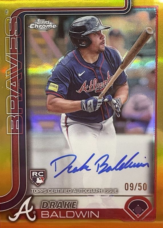 The Drake Baldwin 2025 Topps Chrome #RA-DBA Rookie Autographs - Gold Refractor /50 card in Raw condition has not changed in price in the last 30 days and was last sold for $420.00 .