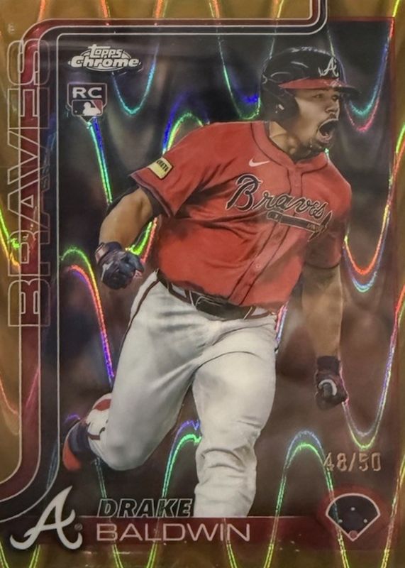 The Drake Baldwin 2025 Topps Chrome Update #USC96 Gold RayWave Refractor /50 Rookie card in Raw condition has moved up $51.00 (+86.4%) in the last 30 days and was last sold for $110.00 .