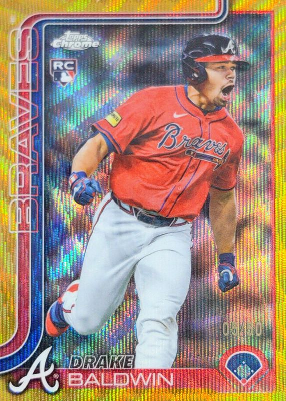The Drake Baldwin 2025 Topps Chrome Update #USC96 Gold Wave Refractor /50 Rookie card in Raw condition has not changed in price in the last 30 days and was last sold for $47.00 .