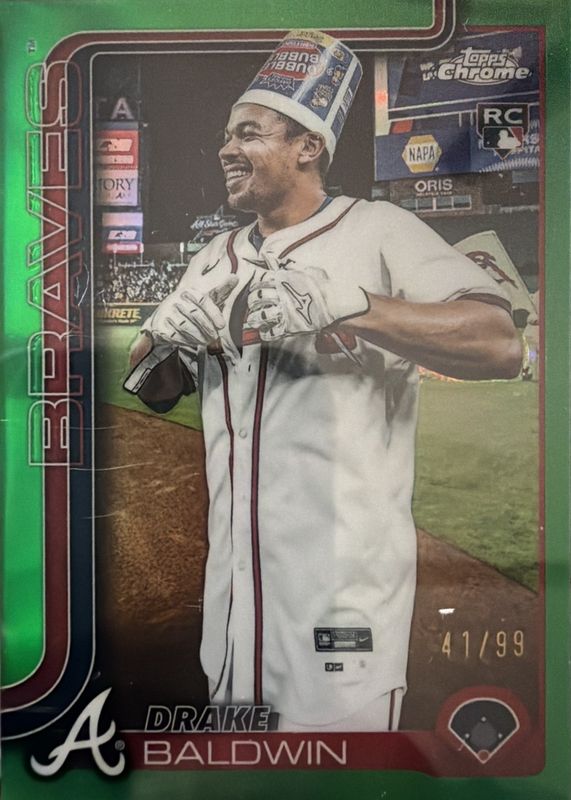The Drake Baldwin 2025 Topps Chrome Update #USC96 Image Variation - Green Refractor /99 Rookie card in Raw condition has moved down -$15.00 (-10.7%) in the last 30 days and was last sold for $125.00 .