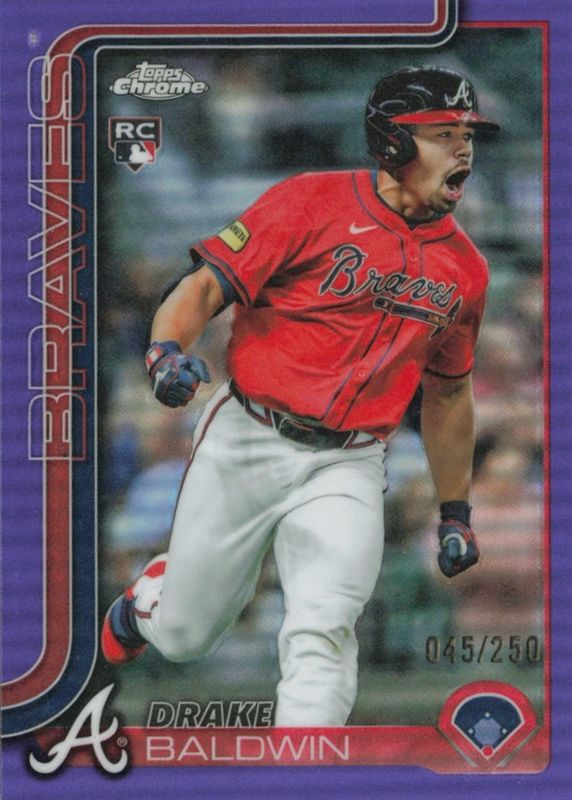 The Drake Baldwin 2025 Topps Chrome Update #USC96 Purple Refractor /250 Rookie card in Raw condition has moved down -$2.51 (-16.2%) in the last 30 days and was last sold for $12.99 .