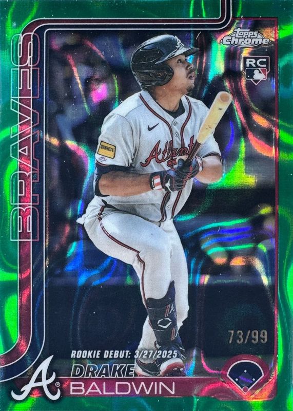 The Drake Baldwin 2025 Topps Chrome Update #USC88 Rookie Debut - Green Lava Refractor /99 card in Raw condition has moved up $2.00 (+26.7%) in the last 30 days and was last sold for $9.50 .