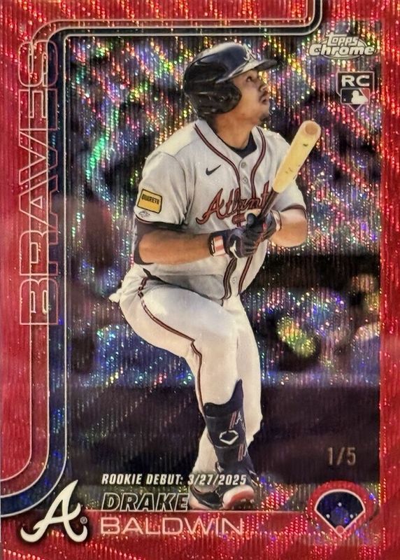 The Drake Baldwin 2025 Topps Chrome Update #USC88 Rookie Debut - Red Wave Refractor /5 card in Raw condition has moved down -$31.00 (-10.3%) in the last 30 days and was last sold for $270.00 .