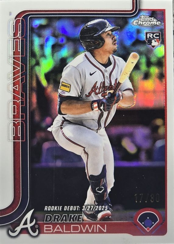 The Drake Baldwin 2025 Topps Chrome Update #USC88 Rookie Debut - White Refractor /30 card in Raw condition has not changed in price in the last 30 days and was last sold for $43.00 .