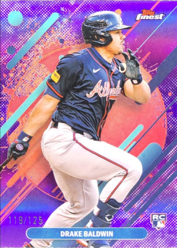 The Drake Baldwin 2025 Topps Finest #287 Base Rare - Purple Refractor /125 Rookie card is 1 of 124 Drake Baldwin's card variations in the 2025 Topps Finest set being tracked by Sports Card Investor, including Common, Rare, Uncommon, Common - Checkerboard Refractor, and Common - Refractor.