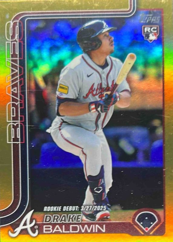 The Drake Baldwin 2025 Topps Update #US113 Rookie Debut - Gold Rainbow Foil /50 card in Raw condition has not changed in price in the last 30 days and was last sold for $51.89 .