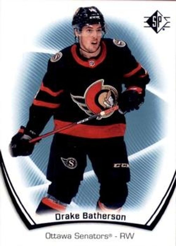 The Drake Batherson 2021 SP #9 Blue card is 1 of 14 Drake Batherson's card variations in the 2021 SP set being tracked by Sports Card Investor, including Authentic Profiles - Blue, Authentic Profiles Jersey, Authentic Profiles - Patterned Foilboard, Authentic Profiles Patterned Foilboard - Gold, and Authentic Profiles Patterned Foilboard - Green.