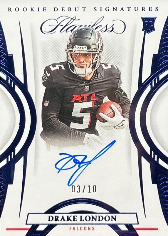 The Drake London 2022 Flawless #RDS-DL Rookie Debut Signatures - Sapphire (/10) card in Raw condition has not changed in price in the last 30 days and was last sold for $100.00 .