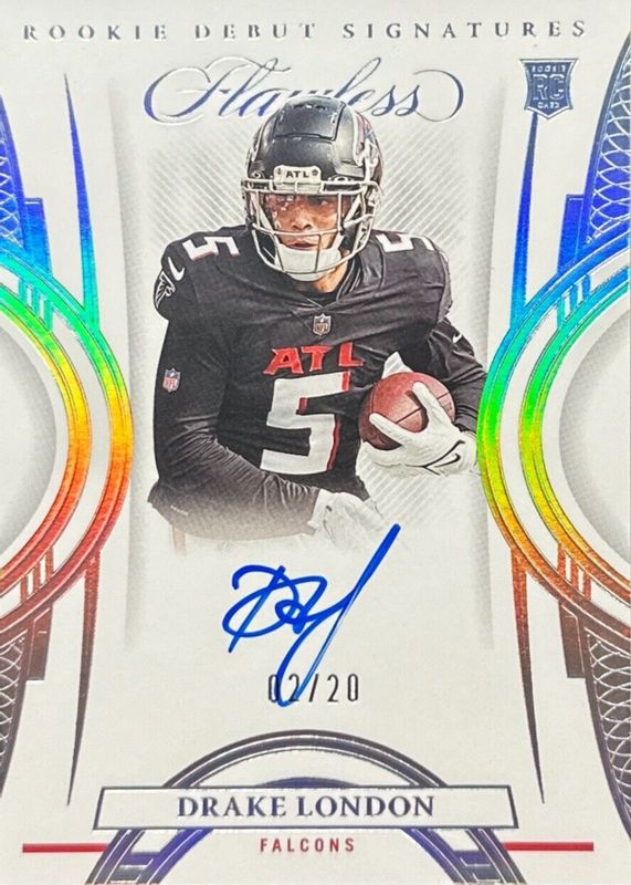The Drake London 2022 Flawless #RDS-DL Rookie Debut Signatures - Silver (/20) card in Raw condition has not changed in price in the last 30 days and was last sold for $71.00 .