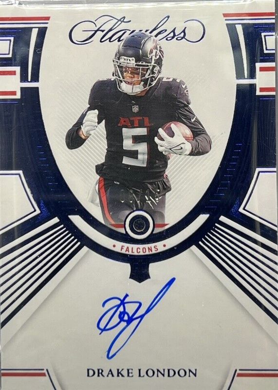 This card is 1 of 50 Drake London's card variations in the 2022 Flawless set being tracked by Sports Card Investor, including Rookie Debut Signatures (/25), Rookie Debut Signatures - Ruby (/15), Rookie Debut Signatures - Sapphire (/10), Rookie Debut Signatures - Silver (/20), and Rookie Frame Signatures (/20).