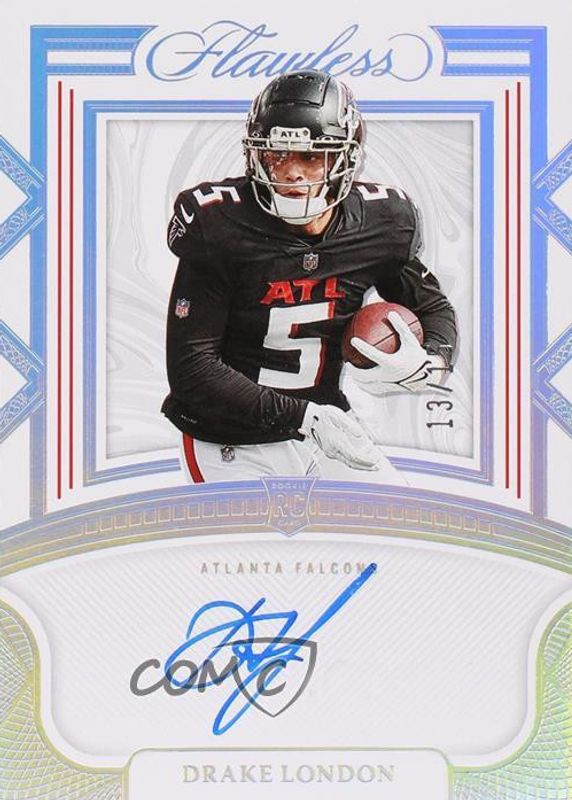 This card is 1 of 50 Drake London's card variations in the 2022 Flawless set being tracked by Sports Card Investor, including Rookie Debut Signatures (/25), Rookie Debut Signatures - Ruby (/15), Rookie Debut Signatures - Sapphire (/10), Rookie Debut Signatures - Silver (/20), and Rookie Frame Signatures (/20).
