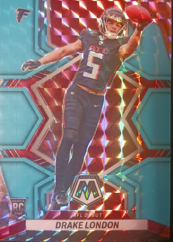 The Drake London 2022 Mosaic #275 NFL Debut - Blue Fluorescent /15 Rookie card in Raw condition has not changed in price in the last 30 days and was last sold for $65.00 .