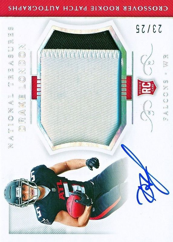 The Drake London 2022 National Treasures #CRPA-DL Crossover Rookie Patch Autographs - Holo Silver /25 card in Raw condition has not changed in price in the last 30 days and was last sold for $112.50 .