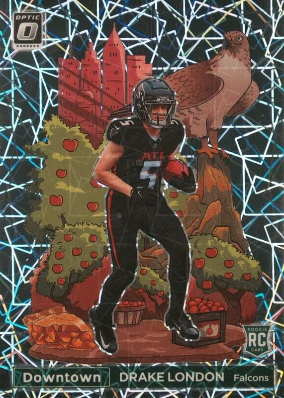 The Drake London 2022 Optic #DT-DL Downtown /(SSP) Rookie card in Raw condition has moved down -$20.00 (-5.3%) in the last 30 days and was last sold for $360.00 .