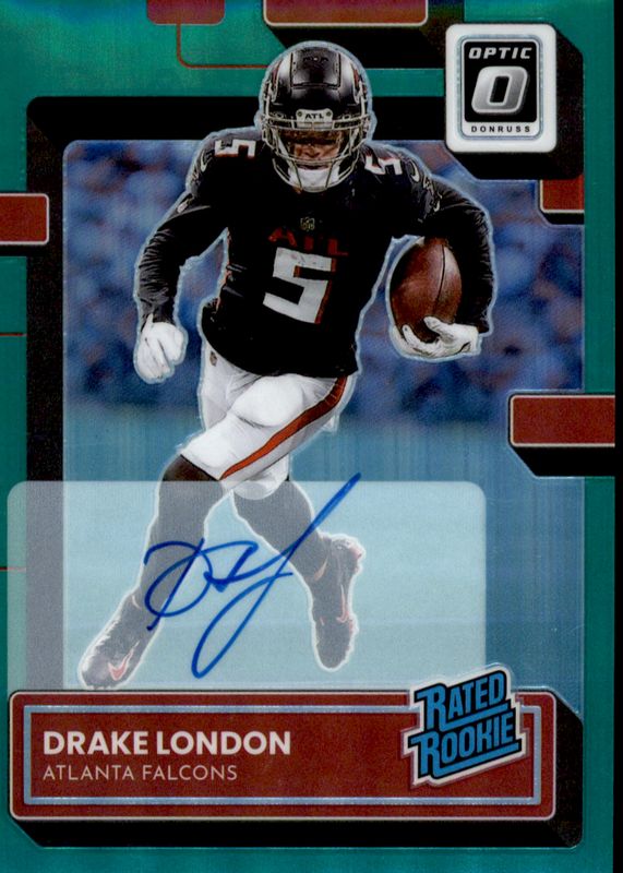 The Drake London 2022 Optic #207 Rated Rookie Autographs - Green /5 card in Raw condition has not changed in price in the last 30 days and was last sold for $317.77 .
