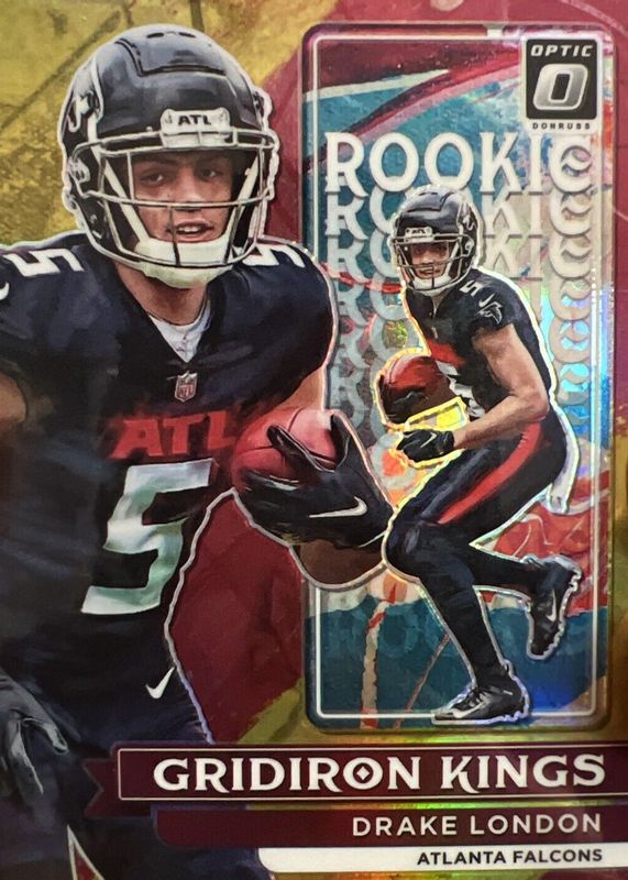 The Drake London 2022 Optic #RGK-6 Rookie Gridiron Kings - Gold /10 card in Raw condition has not changed in price in the last 30 days and was last sold for $60.00 .