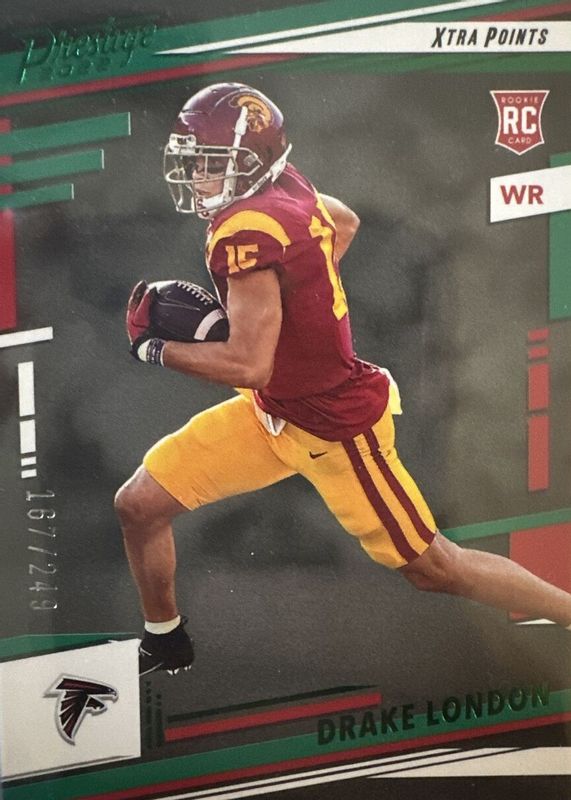 The Drake London 2022 Prestige #309 Xtra Points Green /249 Rookie card in Raw condition has not changed in price in the last 30 days and was last sold for $2.28 .