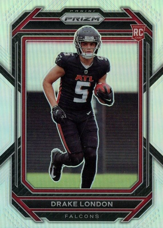 The Drake London 2022 Prizm #308 Silver Rookie card in Raw condition has moved up $4.76 (+112%) in the last 30 days and was last sold for $9.00 .