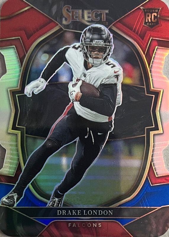 The Drake London 2022 Select #35 Concourse Red & Blue Die-Cut Rookie card in Raw condition has moved up $11.30 (+1,141%) in the last 30 days and was last sold for $12.29 .